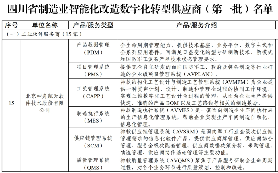 首批供應(yīng)商的遴選條件,主要包括企業(yè)營收規(guī)模、專業(yè)資質(zhì)、屬地化服務(wù)能力、產(chǎn)品或服務(wù)領(lǐng)先性等基本條件,同時(shí)要求近三年獲得過國家級試點(diǎn)示范相關(guān)榮譽(yù),并在制造領(lǐng)域已有一批成功實(shí)踐案例。經(jīng)過企業(yè)申報(bào)、審核推薦、形式審查、意見征求等程序,神軟公司憑借自研的產(chǎn)品數(shù)據(jù)管理系統(tǒng)PDM,項(xiàng)目管理系統(tǒng)PMS、工藝管理系統(tǒng)CAPP、制造執(zhí)行系統(tǒng)MES、供應(yīng)鏈管理系統(tǒng)SCM、質(zhì)量管理系統(tǒng)QMS等工業(yè)軟件產(chǎn)品成功入選。