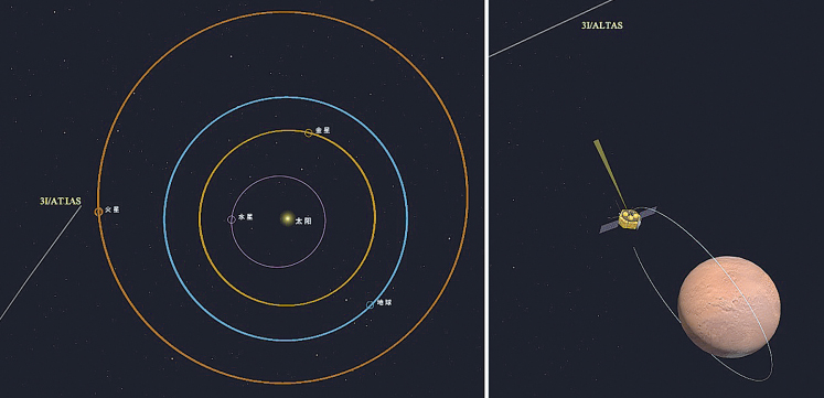 圖為星際天體阿特拉斯與天問一號火星環(huán)繞器相對位置示意圖(右圖是2025年10月3日相機(jī)拍攝時左圖的局部放大)。國家航天局提供